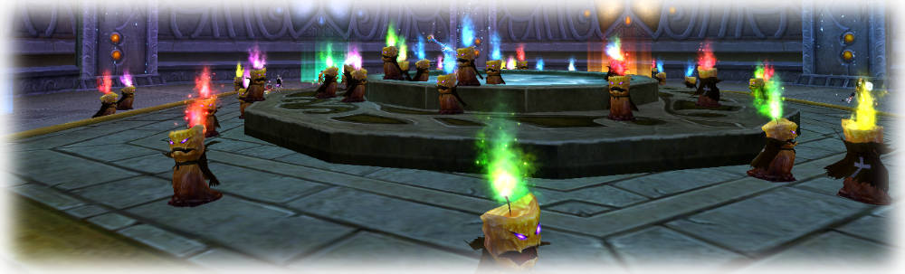 Закрепите за каждым дворцом стихий одну группу игроков. Большая часть из них должна заталкивать монстров нужного цвета в портал, оставшиеся игроки должны зайти в дворец и подтягивать Демонические свечи к колонне, которая расположена в центре дворца.