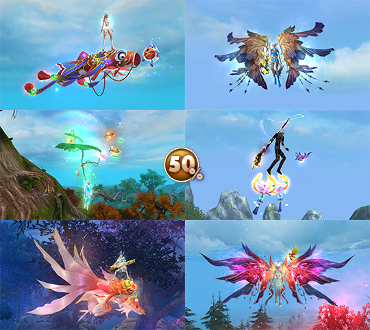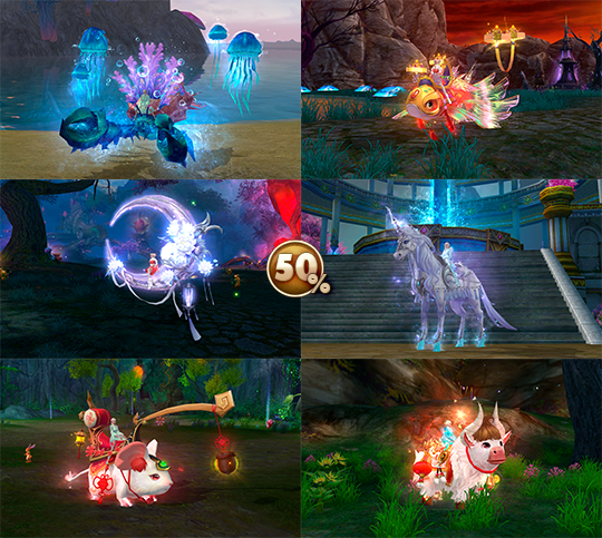 - ездовые питомцы — Серебристый единорог, Счастливчик Ральф, Краб-отшельник, Парчовый карп, Богатая мышка, Сияющий месяц и Мираж дракона истоков;