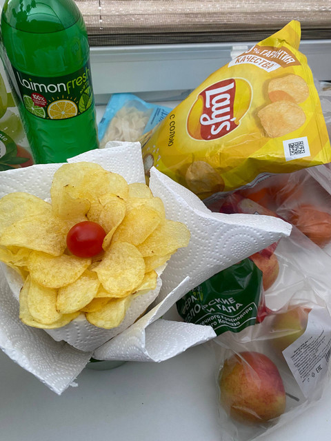 - Создайте букет из подручных материалов или из продуктов. Он должен напоминать настоящий цветочный букет.