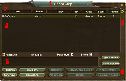 5. Поле для кланового сообщения, его пишет мастер или маршал, писать можно все, что угодно (невозможно написать точку, тире, прописные буквы э, ю, я, так же некоторые другие, мало используемые символы).
