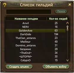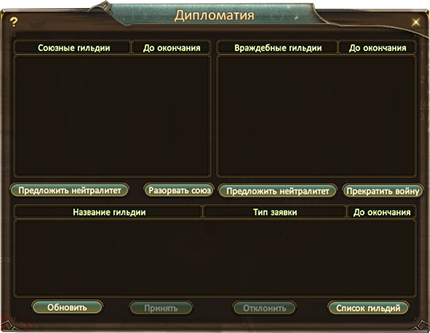 Открыв окно дипломатии, мы можем видеть списки вражеских и союзных кланов. Объявлять войны или создавать альянсы может мастер клана и маршал. Только мастер или маршал может воспользоваться кнопкой "Список гильдий".