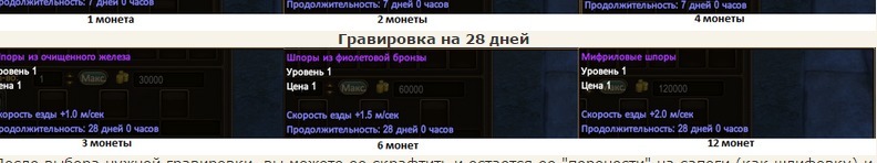 В этом окне можно выбрать тип гравировки, которую вы хотите себе "повесить" на сапоги. Она может быть либо на 7 дней, либо на 28 дней и со скоростью +1.0, +1.5 и + 2.0 к скорости питомца.