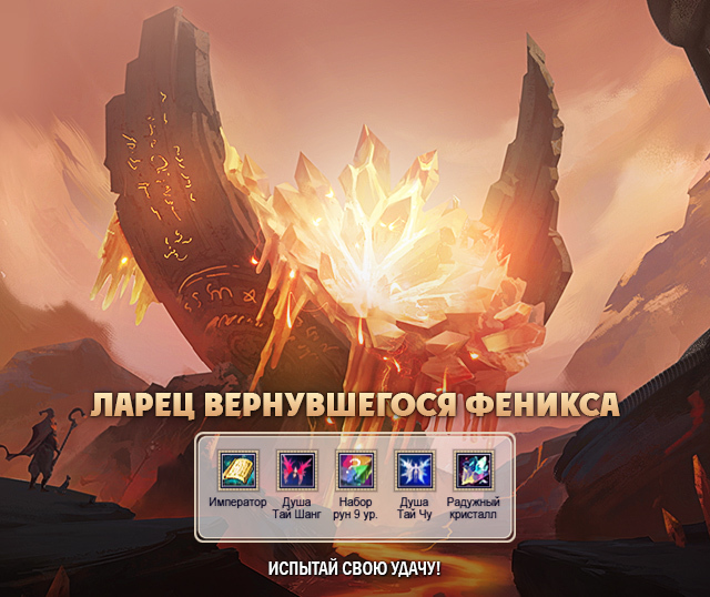 Приобретите комплект из 25 сундучков — и вам гарантированно достанется Ценный знак феникса, взяв комплект из 50 сундуков, вы получите 8 Редких знаков феникса. А купив набор из 100 ларцов вы получите 20 Великих знаков феникса!