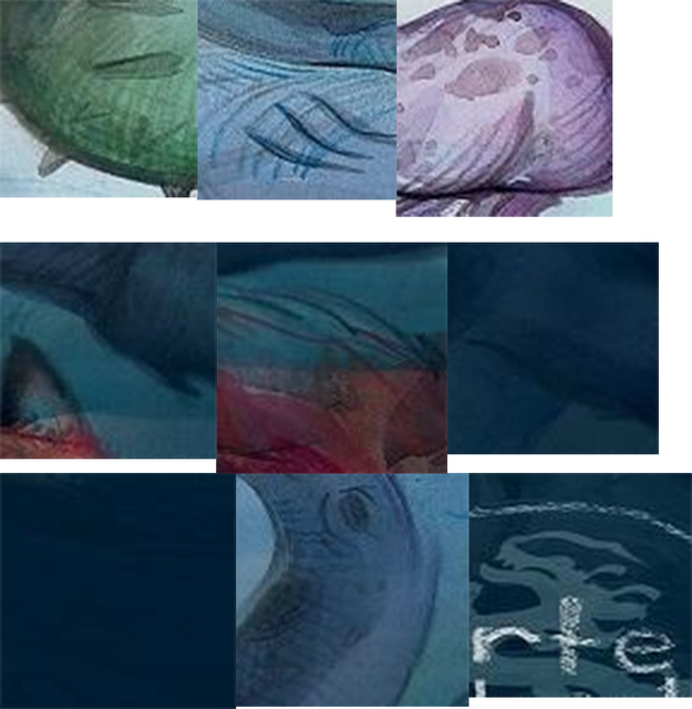 На первых трех фрагментах видна текстура, как на акварельный подмалевок накладываются штрихи карандаша. На других фрагментах этого не видно, на некоторых есть границы между четкими и размытыми участками рисунка. А как выполнен символ дракона? Белилами? Без разводов и текстуры?
