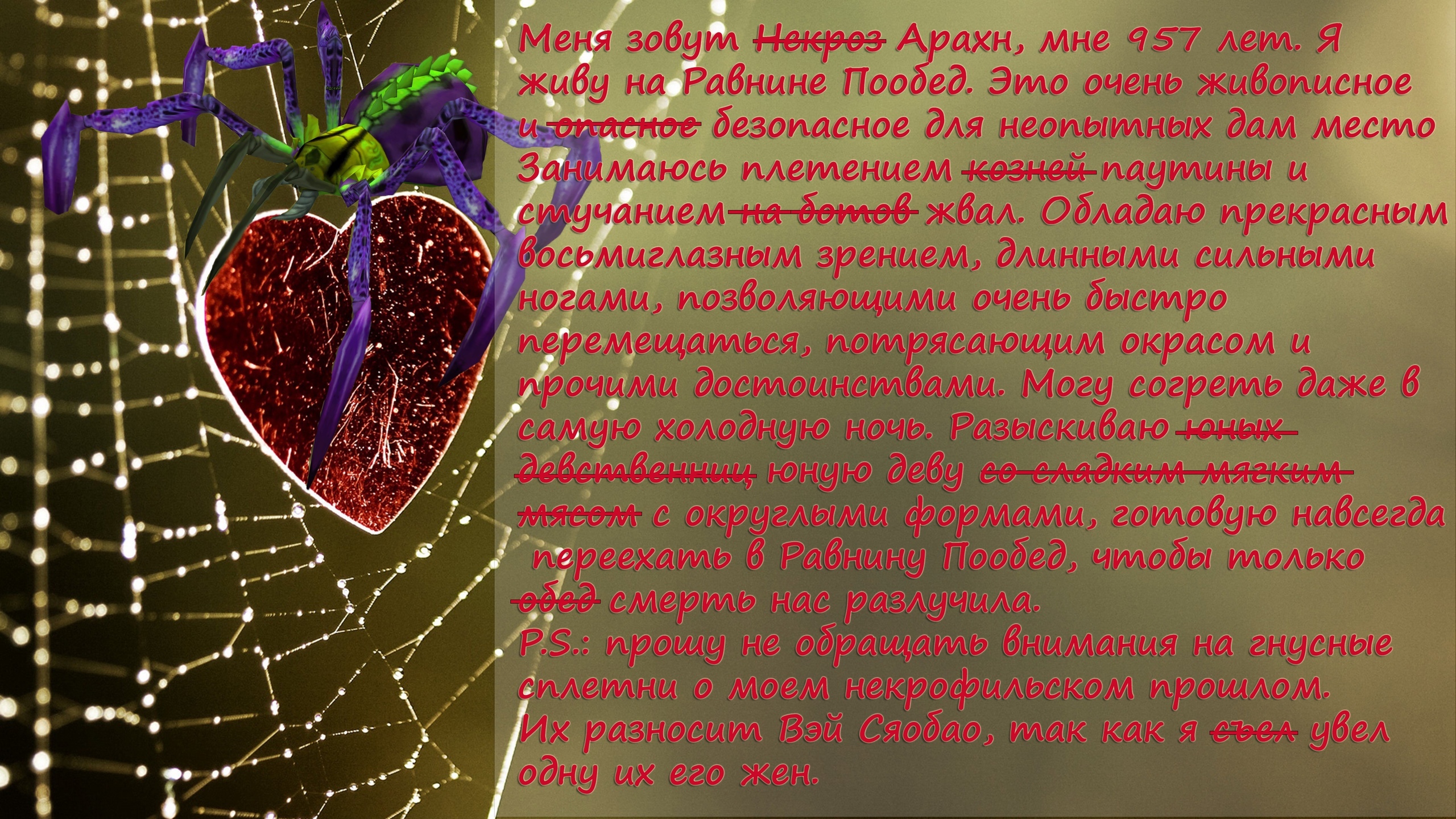 Адский арахнид тоже решил разместить объявление на сайте знакомств.