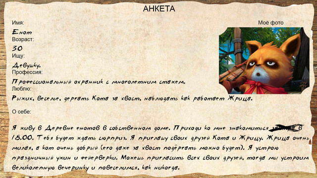 Да-да. Я уже вижу ваши улыбки, мол, эка невидаль. Анкета Енота. Да ещё такая обыкновенная. Неброская. Ничем не примечательная. Вы правы. Эта анкета совершенно обычная и даже, не побоимся этого слова, банальная. Но вы когда-нибудь задумывались над тем, что даже у самых банальных вещей бывает своя история? Вот и у этой анкеты есть своя история, которая...