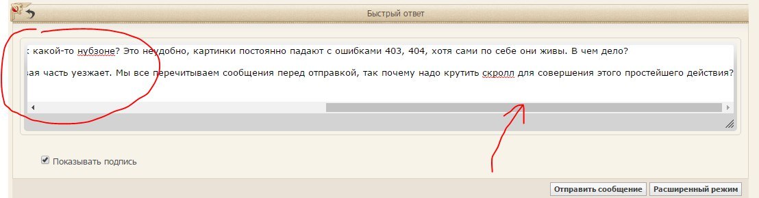 Нельзя ли УБРАТЬ из быстрого ответа скролл (да и вообще из всех форм ответа)? Ну это же просто невыносимо. Печатаешь мысль, и вдруг левая часть уезжает. Мы все перечитываем сообщения перед отправкой, так почему надо крутить скролл для совершения этого простейшего действия?