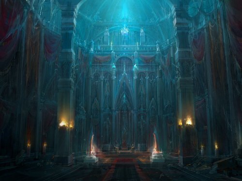 Тропинка которая вела в двор замка была не очень широкой и ограничивалась рядами черепов и костей, которые лежали немереным числом по обе стороны дорожки. Стены двора, высотой в 8-9 метров были украшены рельефными гравюрами изображающие сцены кровопролитья, насилья и войны. Во дворе возвышался фонтан, фонтан вина, или другого алкоголического напитка. Вокруг фонтана, на все 4 стороны были статуй: в север статуя старухи в плаще, кажется слепая, с вытянутой костлявой рукой, которой держала, по ощущениям говорящий череп. На юг была статую матери, у который на руках, вместо ребенка был скелет, или очень худой изуродованный ребенок. На востоке возвышалась статуя танцорши, у которой, при приближении, можно было заметить хвост, и 6 мамелонов(грудки или как там правильно, не могу наити вариант) вместо 2-ух. На западе было поставлена статуя мужчины, с бокалом вина в левой руке, сигарой во рту и шприцом на котором было написано «кайф», в правой.