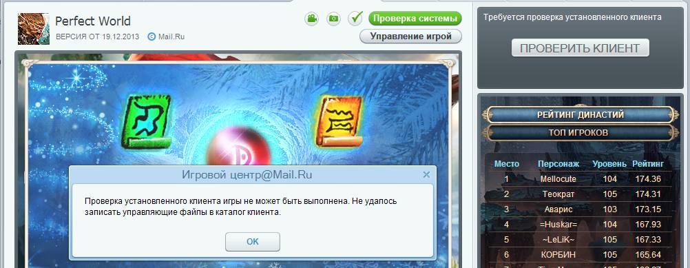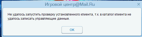 "Проверка установленного клиента игры не может быть выполнена. Не удалось записать управляющие файлы в каталог клиента."