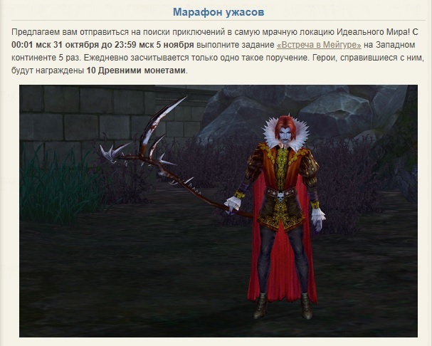 Предлагаем вам отправиться на поиски приключений в самую мрачную локацию Идеального Мира! С 00:01 мск 31 октября до 23:59 мск 5 ноября выполните задание «Встреча в Мейгуре» на Западном континенте 5 раз. Ежедневно засчитывается только одно такое поручение. Герои, справившиеся с ним, будут награждены 10 Древними монетами.