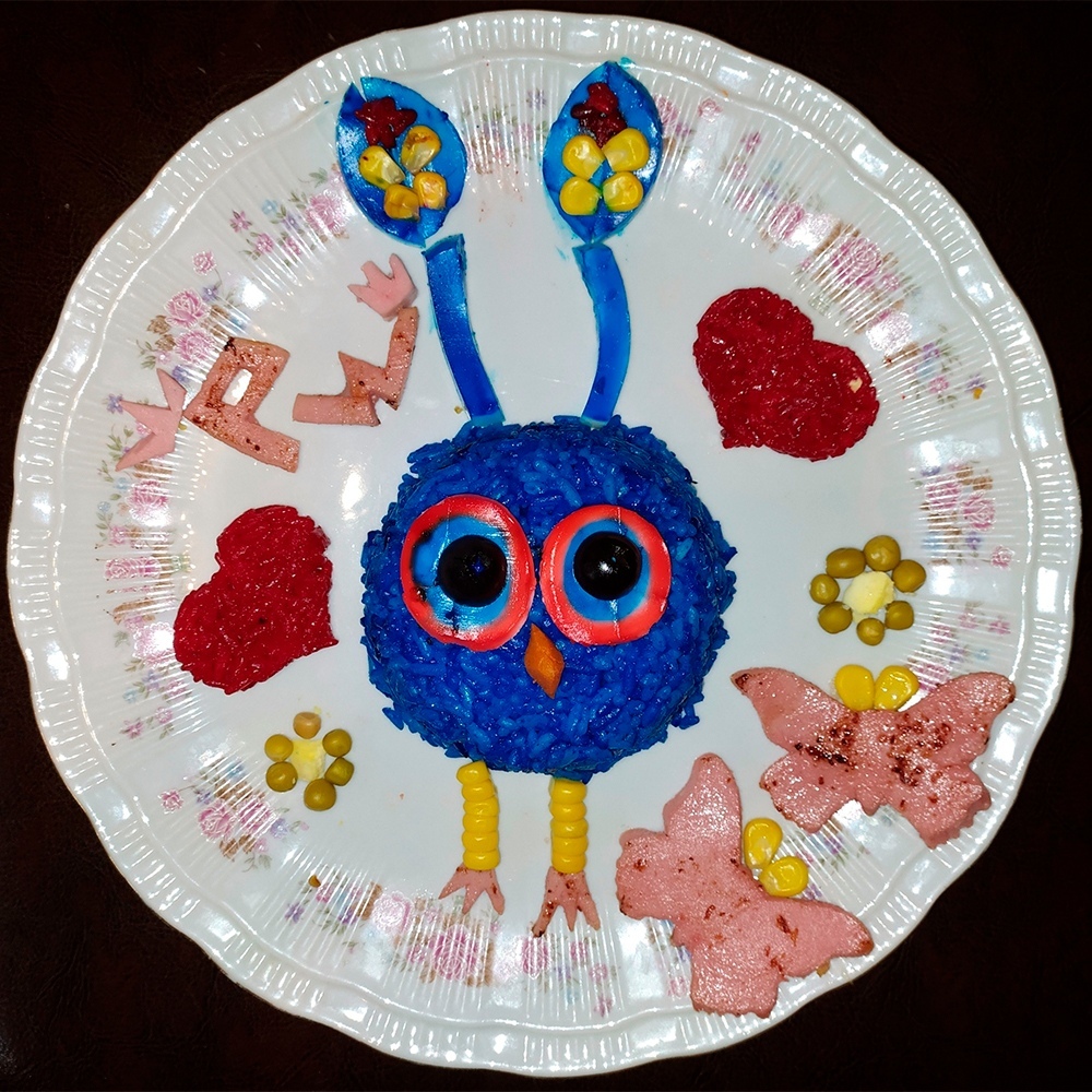 (Чтобы придать нужную форму необходимо поместить синий рис в тарелку с углублением.)