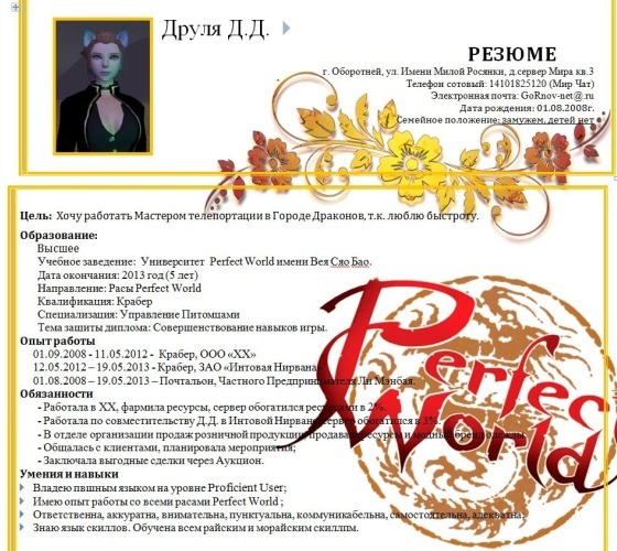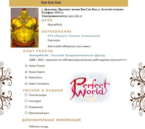 Жил был на просторах Perfect world, маленький милый варчик. Он хотел стать космонавтом, но в один несчастный день его родители попали в аварию в Городе Драконов. Они не вписались в поворот на питоне и врезались прямиком в стену. Они не выжили. Варчик не находил себе места, не понимал что случилось. Ему рассказали друзья семьи,которые забрали варчика, когда тот был совсем малельким, жили они небогато и варчику приходилось работать в юные годы, он усердно учился, закочил школу с серебряной медалью, поступил в военную академию Генерала Ся Фена, но не закочил ее. С поисками работ было очень трудно, но знакомая друлька пригласила его в клуб которым заведовал её отец, это был стриптиз клуб под названием "Темная обитель". Но по обстоятельствам пришлось уволиться после двух месяцев работы. Год летал в облаках, дрался с годзиллой, убивал зомби, вампиров и вурдалаков. И спустя год и несколько месяцев вновь решился начать обычную жизнь стриптизера и подать свое резюме к вам.
