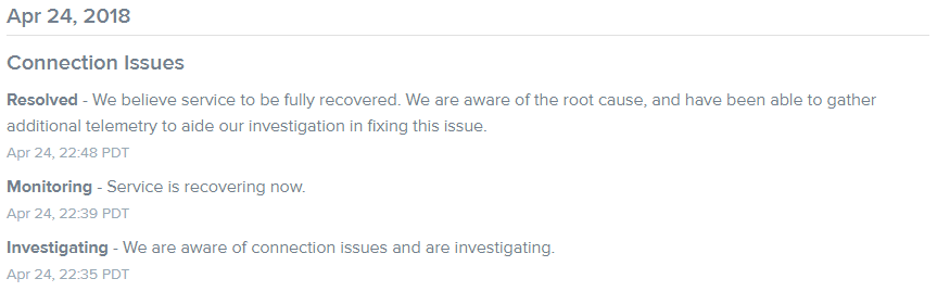 Также это может облегчить работу саппорта, если люди привыкнут сначала идти на страницу статуса и проверять, а потом идти на форум/в поддержку строчить километровые тикеты про неработающую нирвану, сферу алхимика, команды арены, БД, про отключения каждые 10 минут, и так далее.Последний раз редактировалось CMEPTbKOTA; 27.04.2018 в 16:46.