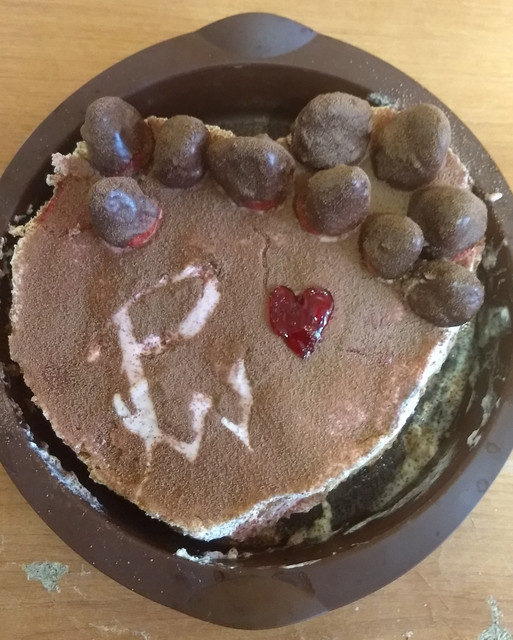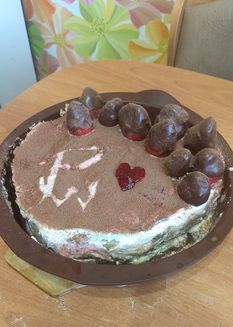 перед подачей посыпаем какао-порошком и по желанию украшаем (я использовал клубнику в шоколаде и кондитерский карандаш)