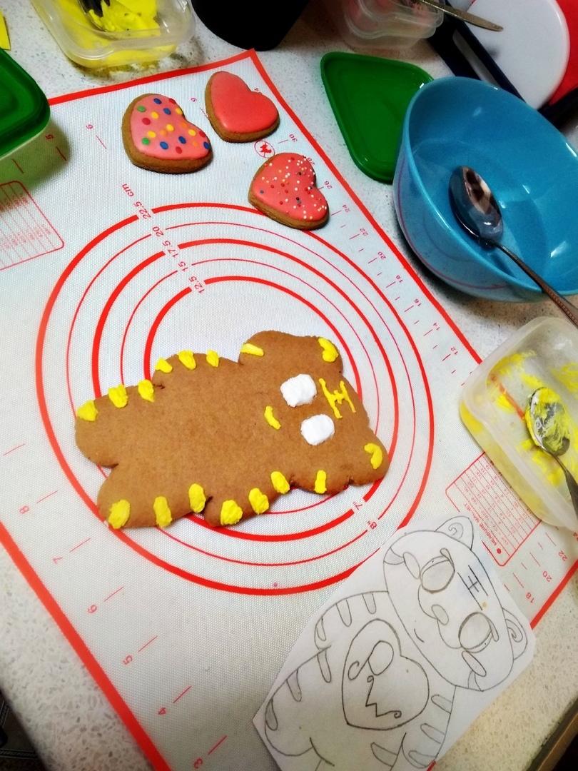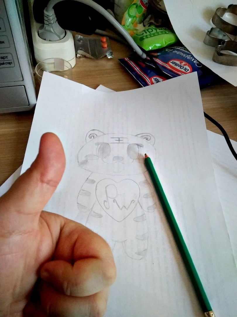 Делаешь тесто, рисуешь предполагаемый пряничек, вырезаешь тесто по контуру, чтобы получился тигренок или же птичка Бобо.