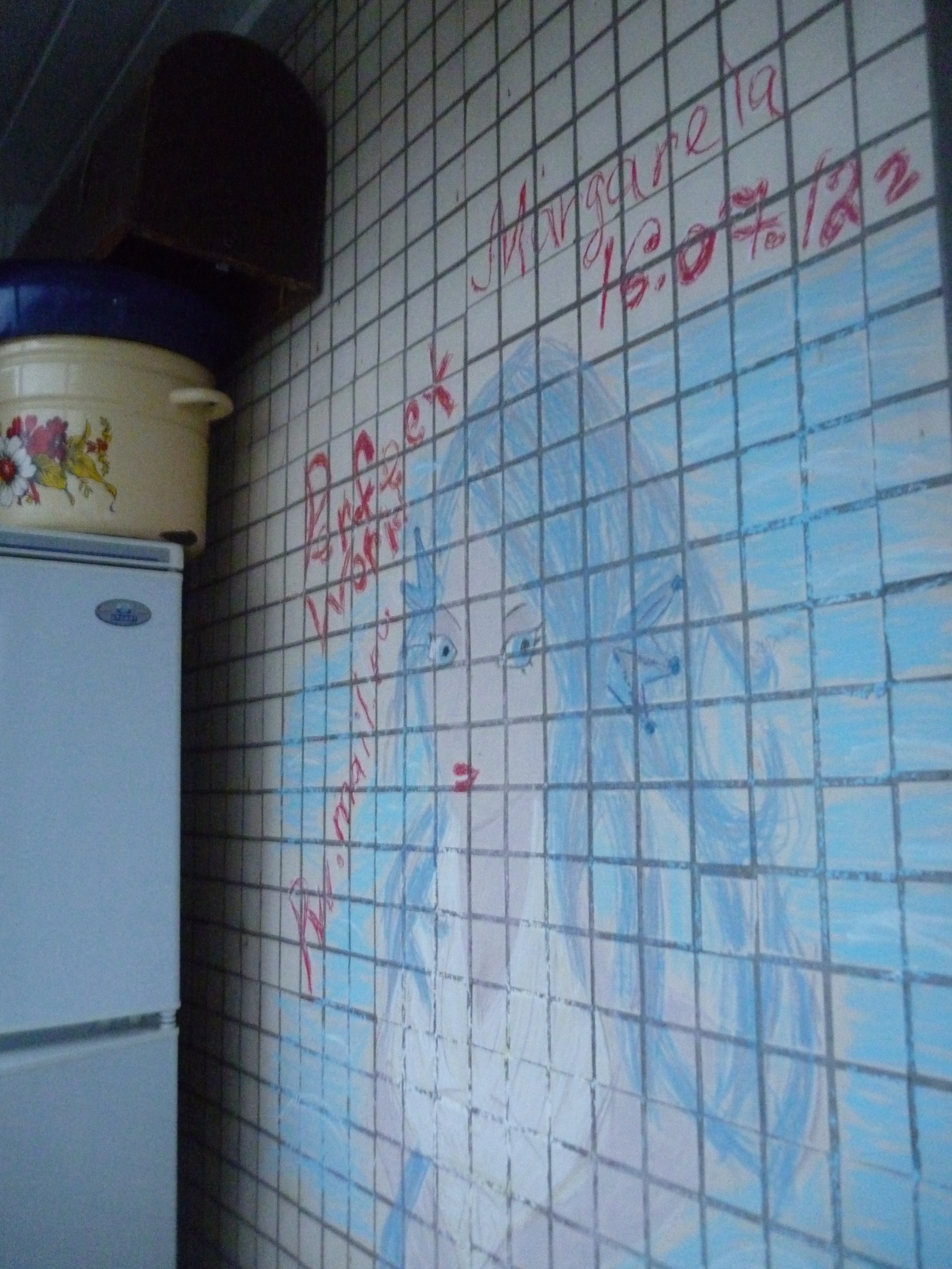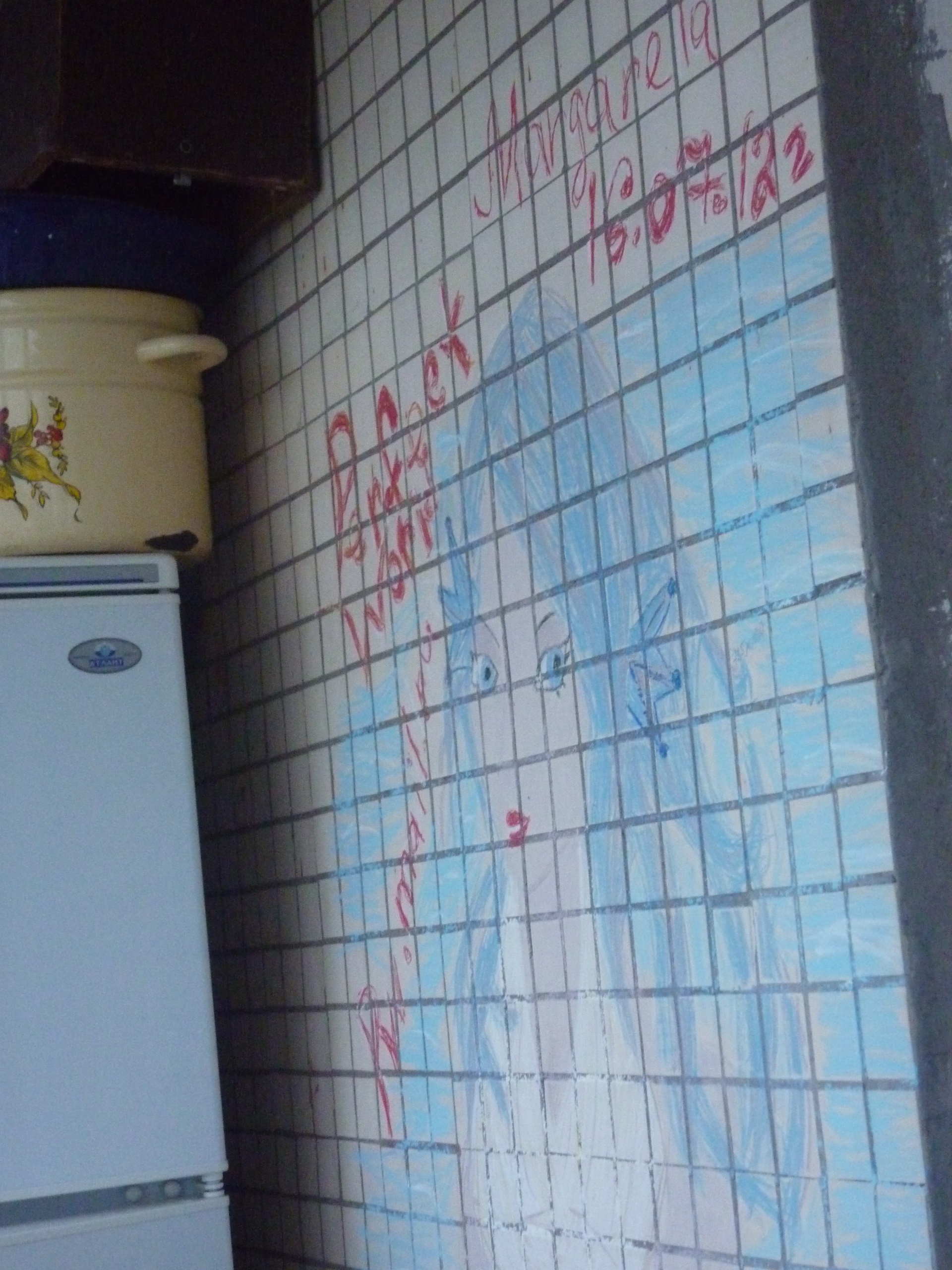 Думаю, нет ни у кого рисунка, у которого была бы подобная история. Сильно расписывать не буду. Просто напишу, что меня из многих мест выгнали, а когда я нашла более-менее пригодное место, чтобы создать своё творение, пошёл дождь... точнее будет сказать - ливень. Прикрывала рисунок, как могла: нашла в гараже ткань, всякие картонки; стала закрывать этим всем рисунок. Он всё равно ослаб, стал бледным. Мелков не хватало, а мелкими остатками рисовать уже невозможно, так как руки и так уже в кровь разодраны. Фотографировать я совсем не умею (извините за качество), так что получилось что-то вроде этого (выбрала три самые нормальные фотографии [надеюсь, можно выставлять больше одной]):