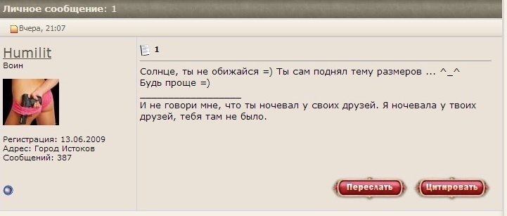 Не поспоришь, равносильный обмен комплиментами - отсутствие достоинства девушки и привычка держать мышку не так, как большинство)) Интересно, а если переключиться на твою ОГРОМНУЮ ЖОПУ (с), ты в ответ выдашь то, что у меня большие глаза?))