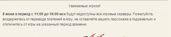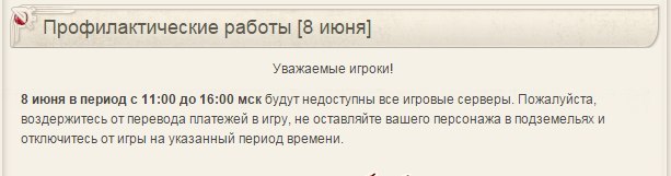8 июня в период с 11:00 до 18:00 мск будут недоступны все игровые серверы. Пожалуйста, воздержитесь от перевода платежей в игру, не оставляйте вашего персонажа в подземельях и отключитесь от игры на указанный период времени.