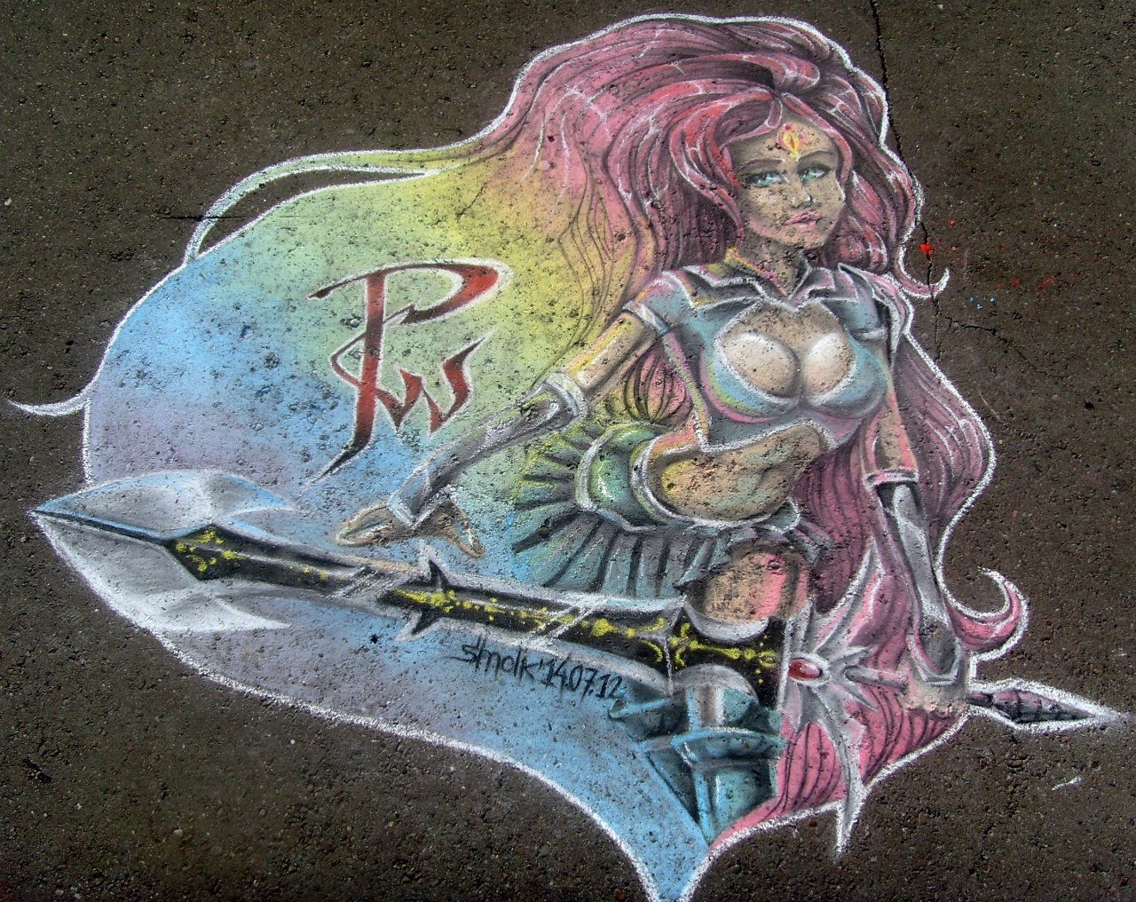 Я когда свою работу рисовала, меня прогоняли. Так как я сейчас в деревне, то асфальт есть только на шоссе (где мне неохота сидеть, ибо собьют нафиг) или на дороге к водокачке. Но там типа частная территория и охранник (когда я уже половину нарисовала), собрался меня прогнать, гад. В итоге с трудом свою территорию отстояла)