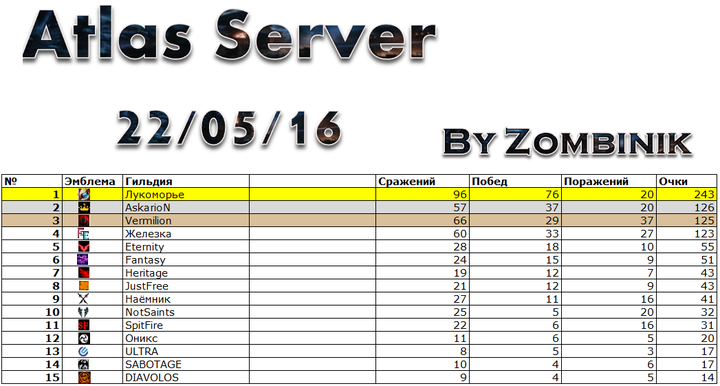 Турнирная таблица на этот год завершена и лидером этого сезона по праву считается гильдия Лукоморье по всем показателям. А так же благодаря сдержанной политике по отношению к гильдиям на уровень ниже, на сервере Атлас в таких же захватывающих противостояниях как ЛукоморьеVsVermilion, запомнились и выбились в лидеры такие гильдии как AskarioN, Heritage, Fantasy, Eternity, JustFree и другие.