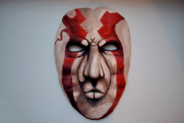 Маска сделана с помощью техники папье-маше (Бумага, газеты, гуашь, клей)
