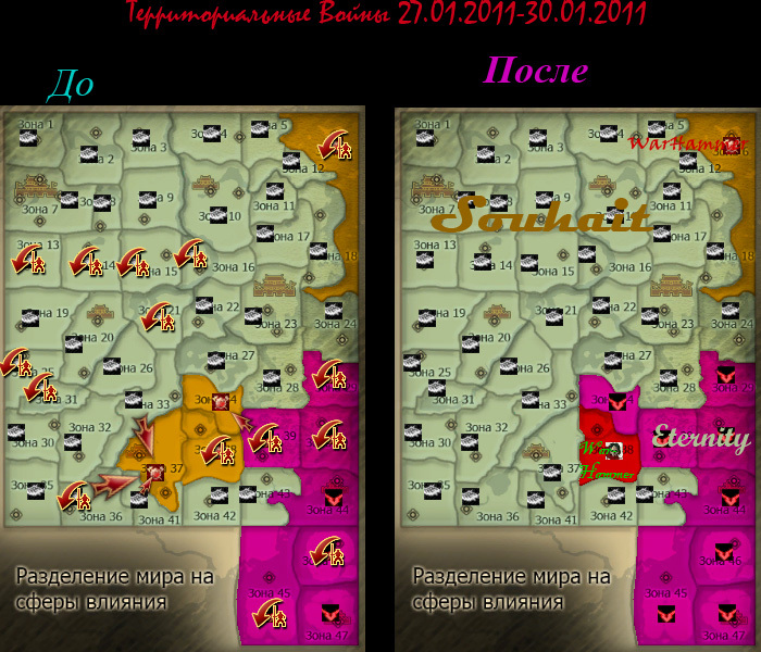 Souhait все движется к завершению своей цели, еще территория в их активе. По неофициальным источникам на ТВ WarHammer vs. Souhait, из клана WarHammer никто не вышел против Souhait. А вот академию Souhait они успешно отбивают. Как известно Souhait оттвинковали территории, на которые могли поставить Eternity. В итоге Eternity пришлось ставить на Souhait и были отбиты за 40 минут. Самое длинное ТВ за прошедшие полтора месяца.Если много (п*здишь) говоришь, отрежь язык!