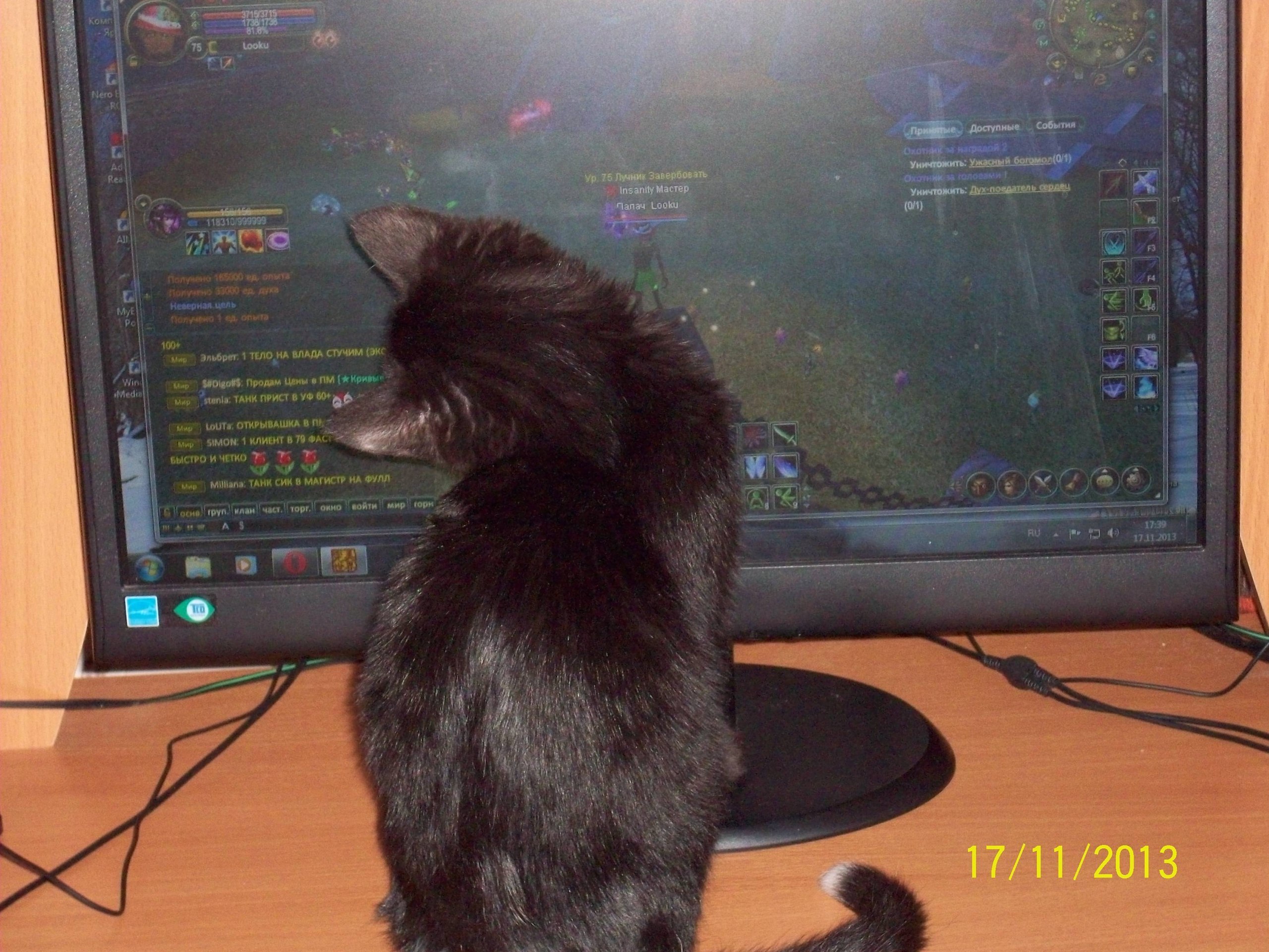 Вот она моя пакостливая красавица Милка. Ей всего 6 месяцев, но компьютер она уже освоила. Когда я просто смотрю сериальчики или с кем то переписываюсь, она не проявляет интереса к клавиатуре или мышке, но вот когда я начинаю играть, она коварно крадется и выбирает момент, когда же мне « помочь». Самое любимое время для «помощи» это посещение друледанжа. Мне кажется, она даже смотрит в угол, где выведены квесты и выжидает когда там появится цифра 6. Эту волну с милыми мобами она особенно не хочет, чтоб я убивала. Шестерка вызывает у нее непреодолимое желание пробежать по клавиатуре по верхним кнопочкам, после чего игра не активна и на экране выскакивает калькулятор или микрософт офис. А когда появляется финальный пит, она мне уже на самом деле помогает, ловит его по всему экрану( хорошо, что сзади стена и монитор не упадет в пропасть) , прыгает за мышкой которую я навожу на скиллы и даже полумявкает подбадривая, как бы говоря – « Убивай быстрее! Дай поесть!»