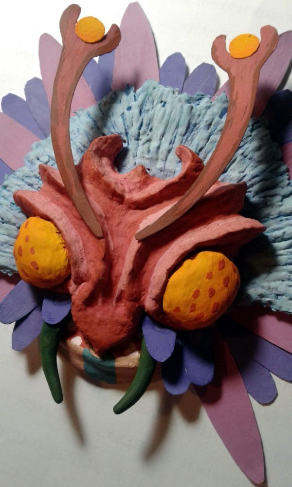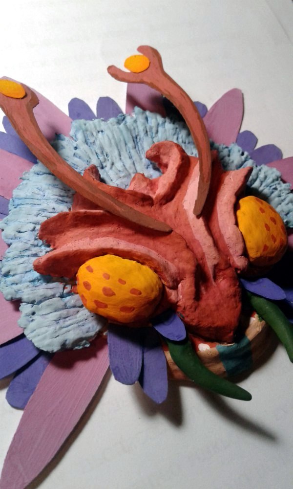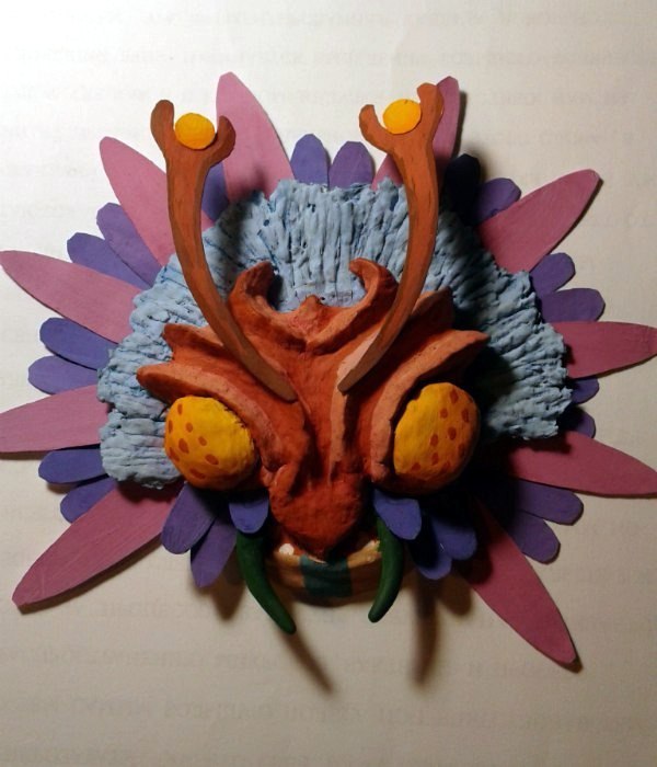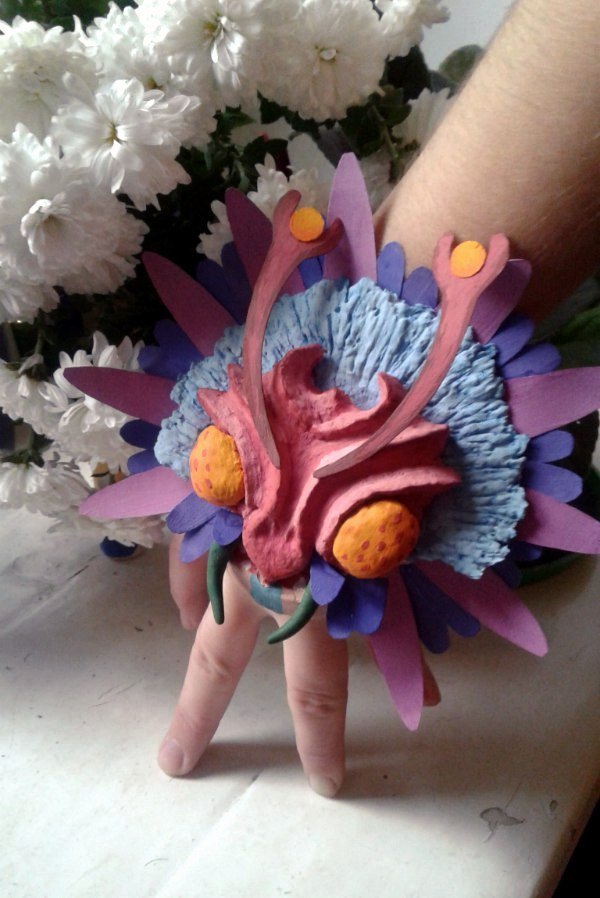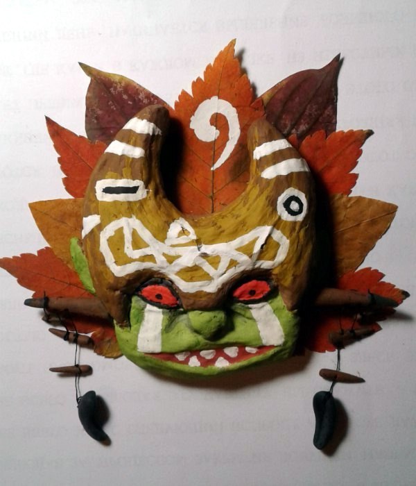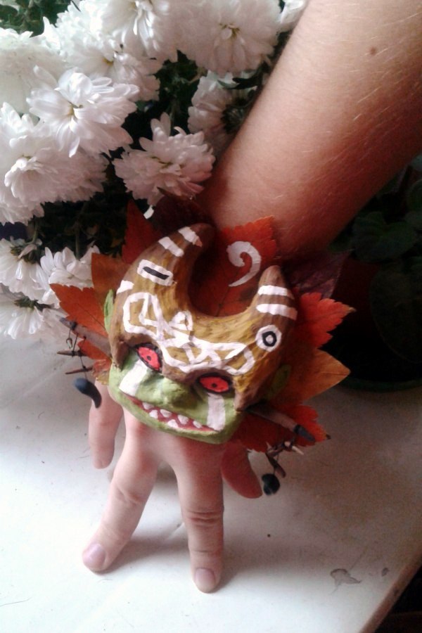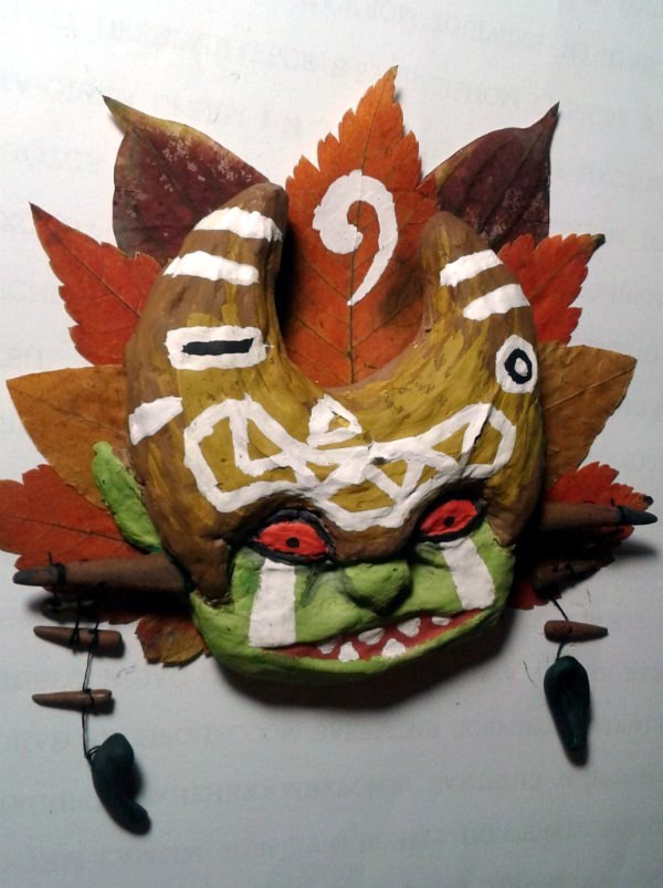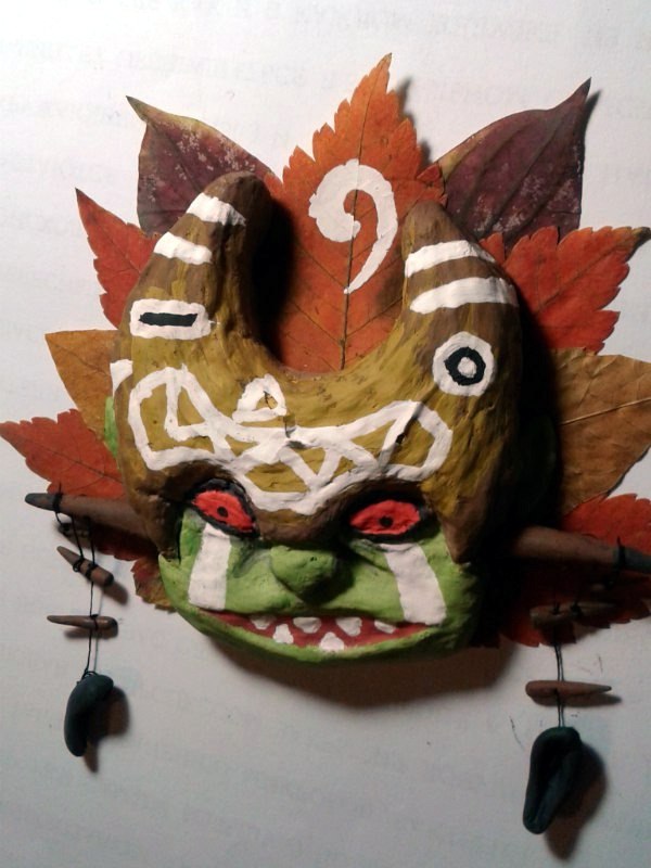 Материалы: папье-маше, местами полимерка, местами бумага, немножко листьев, заляпавшая полкомнаты гуашь, тапок с камерой, две кривые, но очень старательные руки и отвратительное освещение.