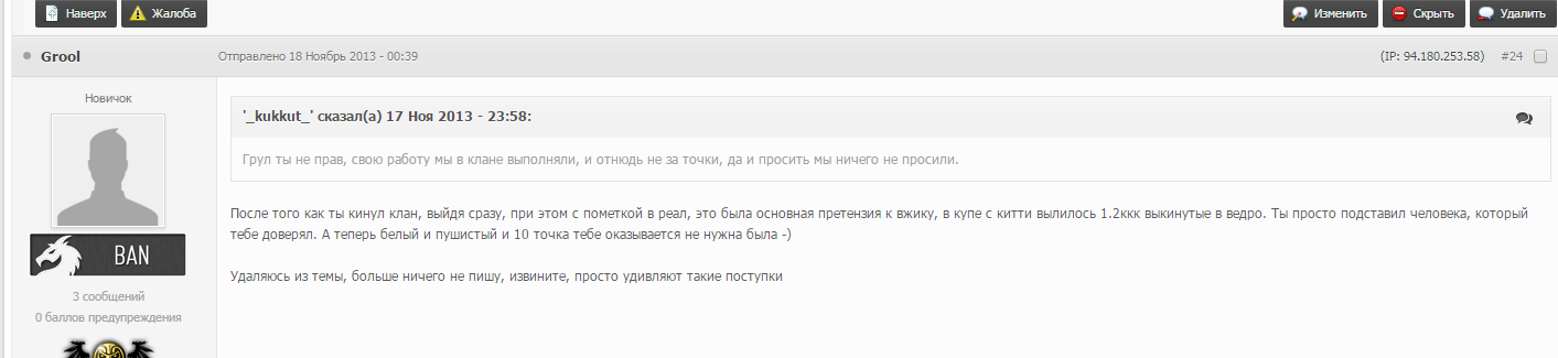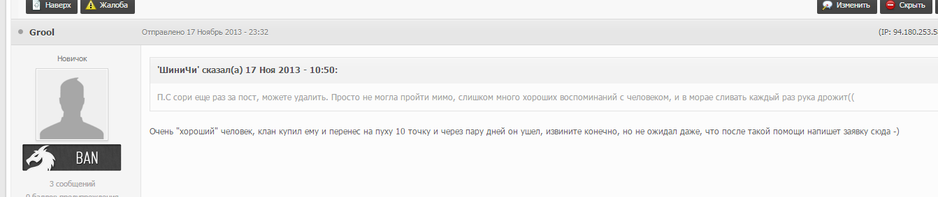 Сообщение от -caxap- Жутко неадекватные посты, пожизненно банить нужно Так он же пытался очернить своего бывшего соклана. Да и вообще нигде не приветствуется отпись не пойми кого в заявках других кланов. Это же не темка для общего флуда.