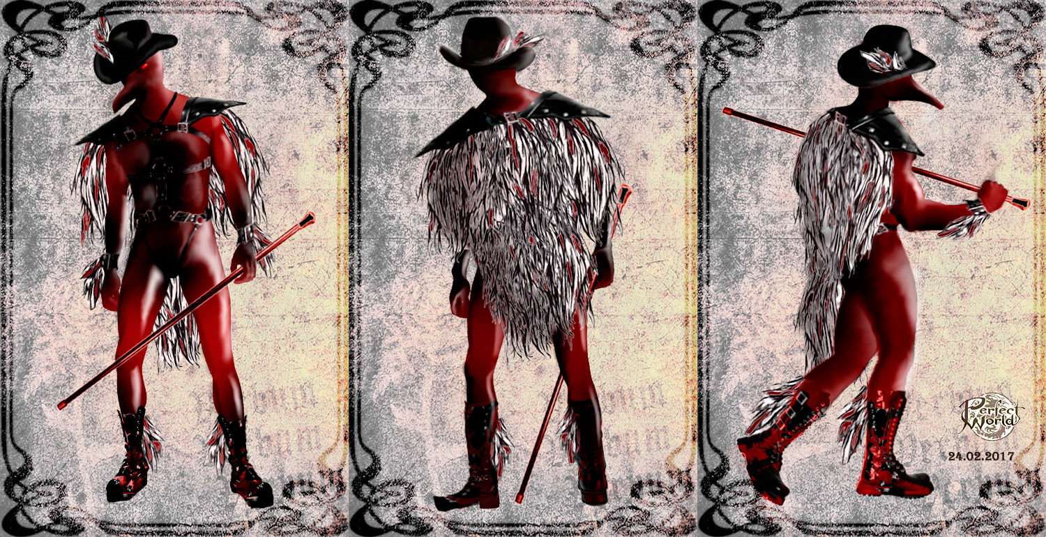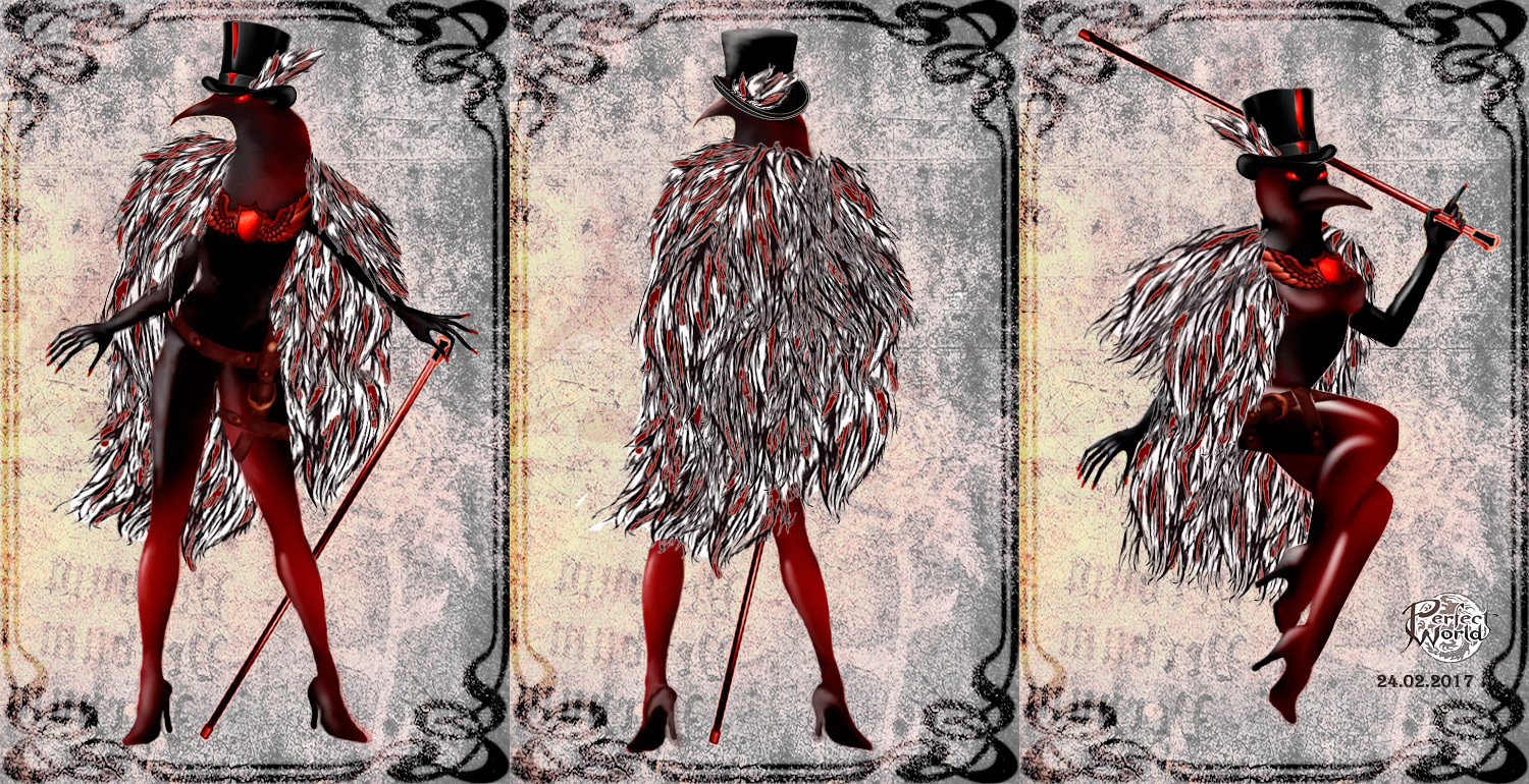 - Головные уборы - маска чумного доктора, цилиндр (Ж), ковбойская шляпа (М); перчатки (в женском варианте - с удлинёнными пальцами, что делает руки похожими на лапы птиц; в мужском - с декоративными напульсниками)