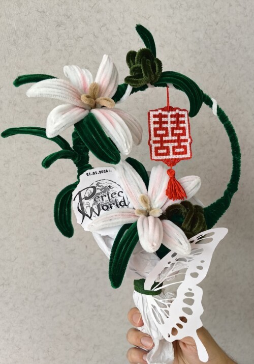 поэтому представляю вам цветочную композицию из лилий. основа сделана из металлической опоры для цветов, а в центре букет украшает китайский иероглиф "двойная радость", ведь создавая что-то своими руками, всегда испытываешь радость от процесса.