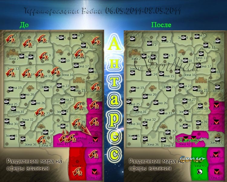 Souhait забирает Порт Мечты (44) за 6 минут у Eternity. Трипл Eternity-RaiseHell-HellSouls на Souhait не увенчался успехом, все были отбиты. И долгожданное событие! Наконец-то! За последние 3 месяца, 3-ий клан вышел на карту. Сможет ли Genso удержать свою территорию? Кто будет ставить на Genso? И куда будет ставить Genso?