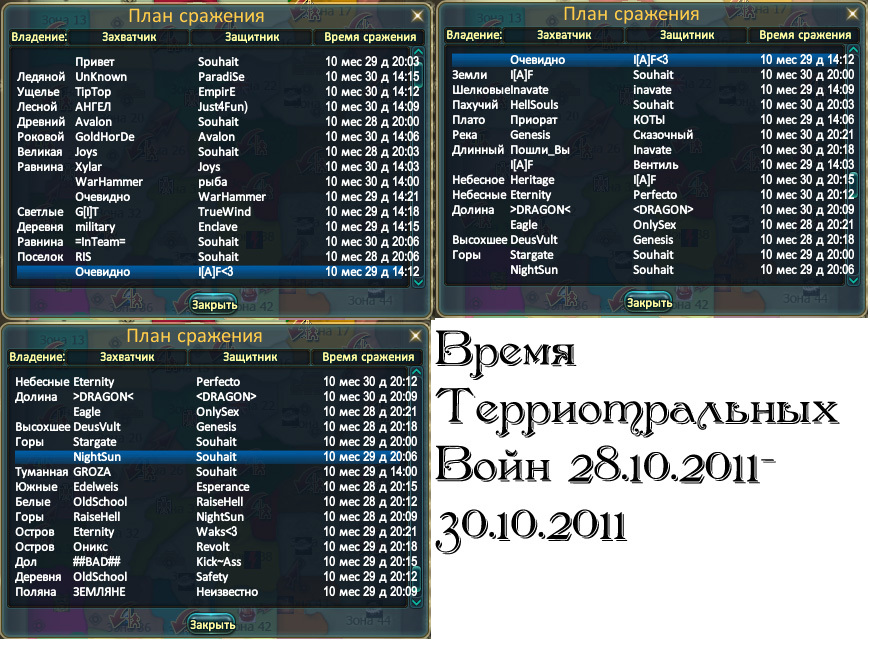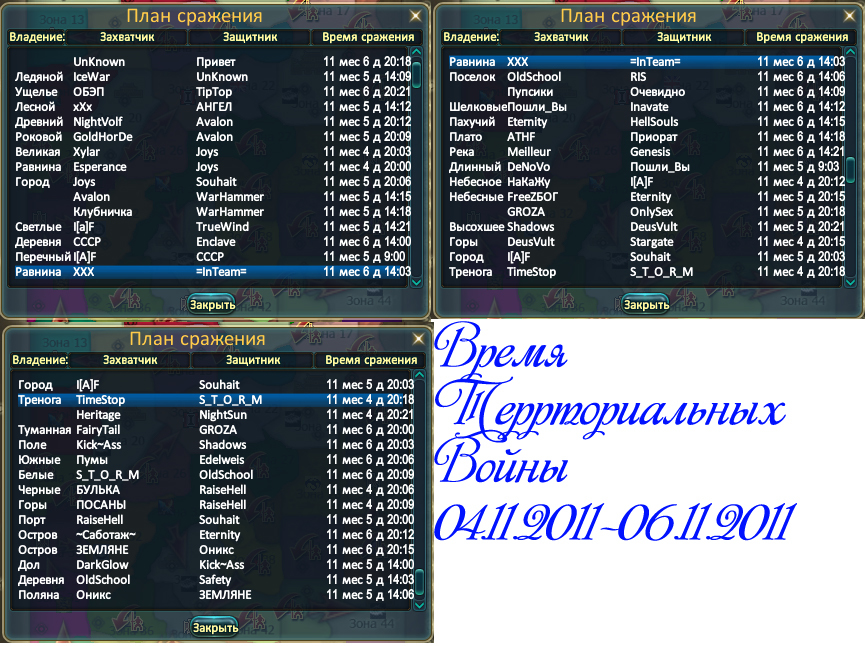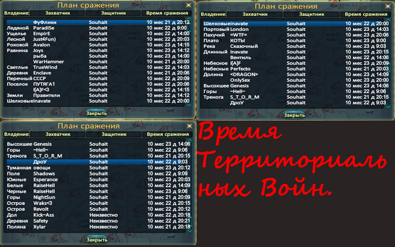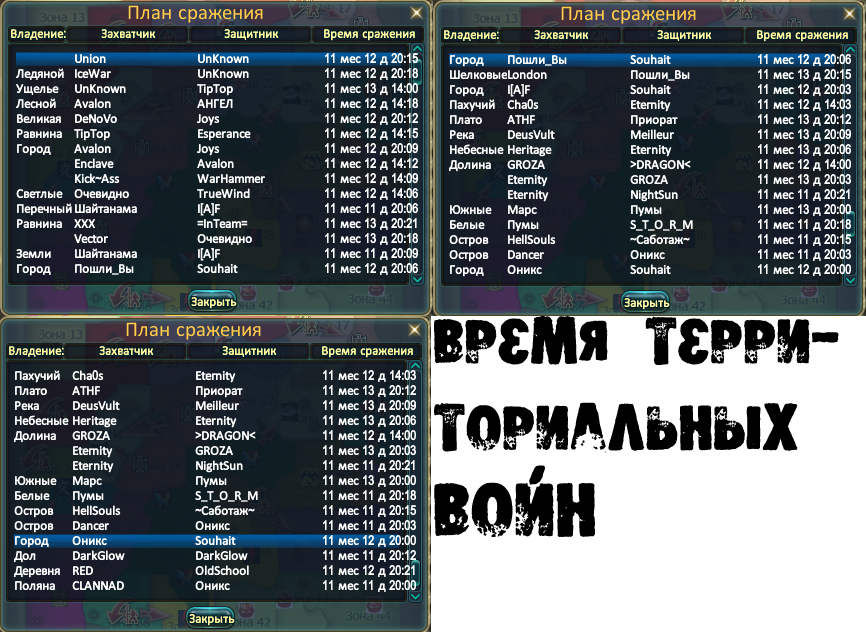 Итак, наконец-то сервер дождался Территориальных Войн. После бага, все старые ставки сохранились, поэтому некоторые территории до сих пор держат Сохатики(Souhait), не считая территории 2 и 1 уровней. Поздравляем Всех с новыми Территориальными Войнами. Надеюсь, будет интересное противостояние кланов Антареса!Последний раз редактировалось scurp; 23.10.2011 в 23:45.