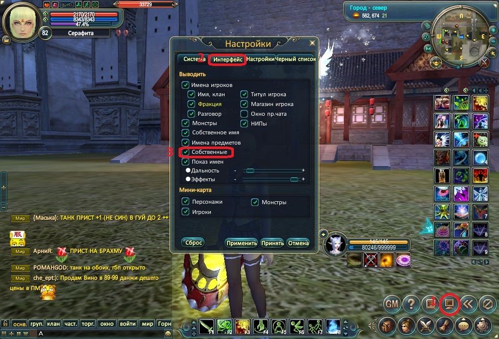 настройки/интерфейс и ставишь галку на "Собственные" под "Имена предметов". только учти, что это уменьшает быстродействие.