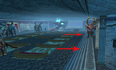 Затем бежим назад в большую комнату и забегаем в арку к Жестокой душе. С этого босса не добывается ничего ценного. Затем, пробегаем прямо в следующую арку, сворачиваем в коридор с ладошами и попадаем в комнату со следующим боссом - Могучий древний змей. Обычно он нужен в одном из заданий и с него так же как и с предыдущего босса ничего ценного не добывается. После того, как вы справитесь со змеем, возвращайтесь назад на балкон. Заверните в соседнюю арку, там будет несколько монстров. Их можно убить, а можно пробежав, далее спрыгнув с балкона, забегите под него, чтобы монстры отагрились. В комнате будет стоять Могучий бог барабанов.
