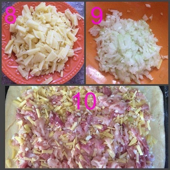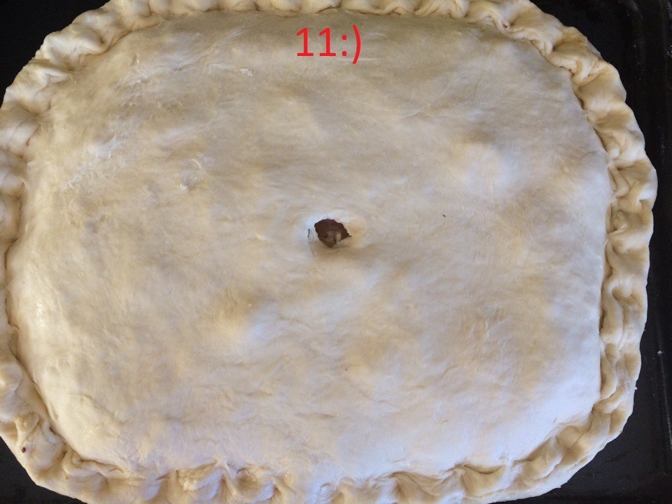 11.Отделяем тесто на две части.Первую часть раскатываем и на противень .Добавляем все ингредиенты (лучок ,картошечку и курочку).Другую часть теста раскатываем и укрываем словно одеялком другую часть теста