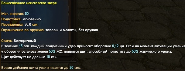 Божественное неистовство 20 секунд должно понижать входящий магический урон на 50%, а Великое неистовство в течении 10 секунд создает щит, который поглотит входящий урон в зависимости от физ атаки оборотня, т.е. например, при планке в 60к, оборотень поглотит щитом 30к урона, а дальше по нему будет лететь полный урон.