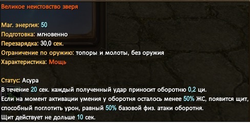 Проведя серию ударов по своему танку, могу сказать, что описание скиллов неверное. Щит действует не 20 сек, а 10, а точнее, появляется 2 разных щита, 1 - набивает чи и действует 20 сек, 2 - понижает входящий урон. Судя по входящему урону и распрыжке длительности второго щита, описание самого понижающего щита неверное.