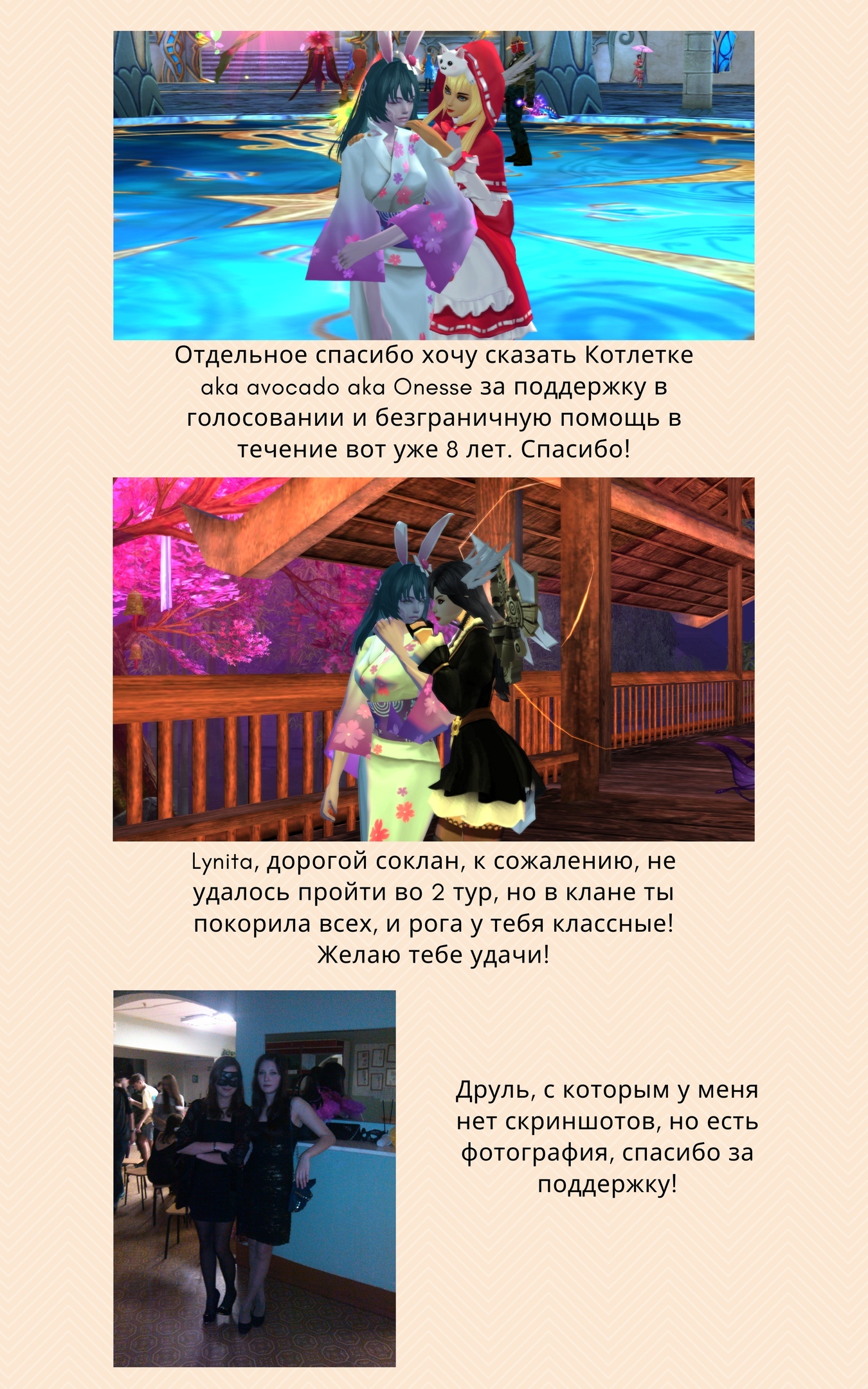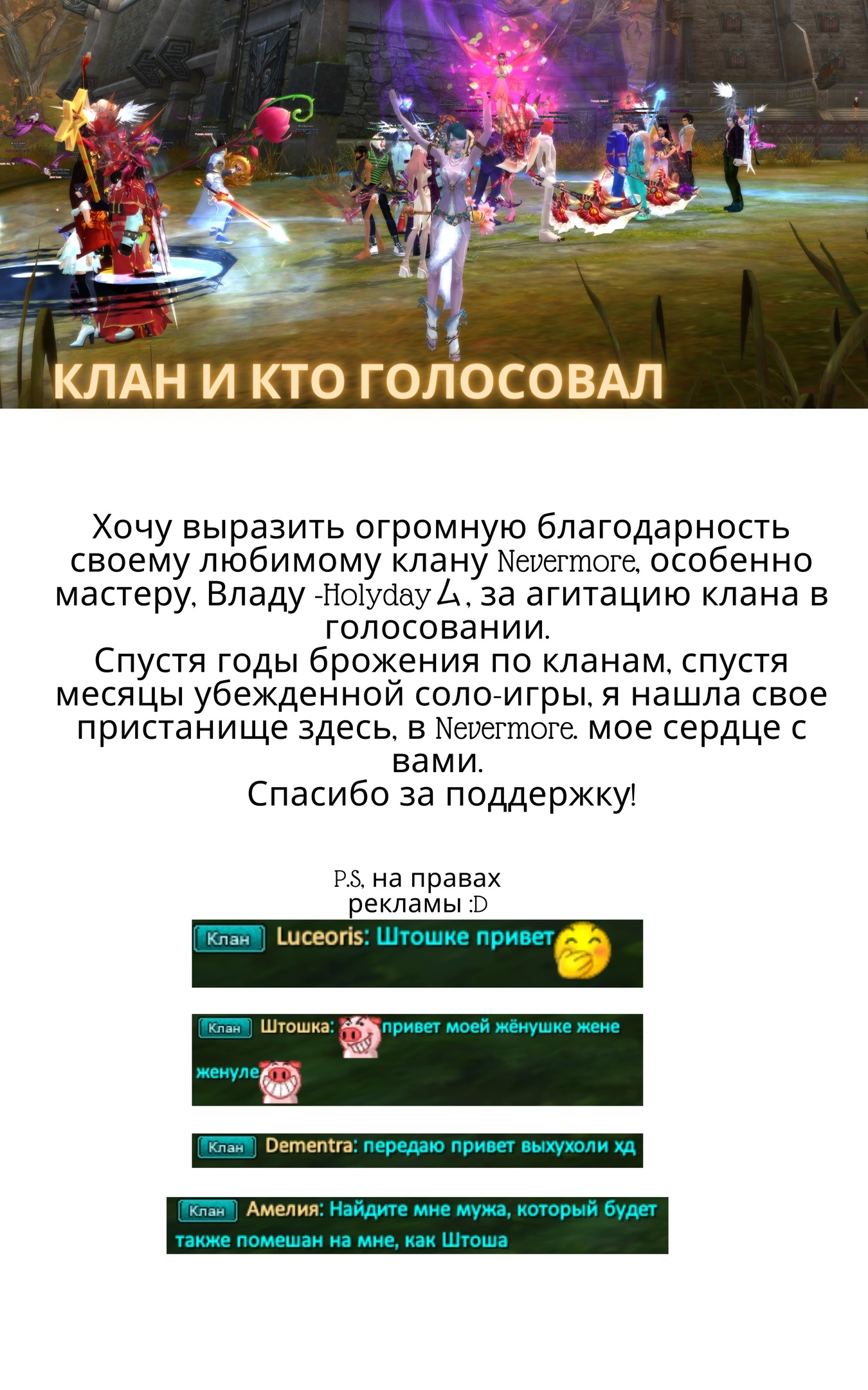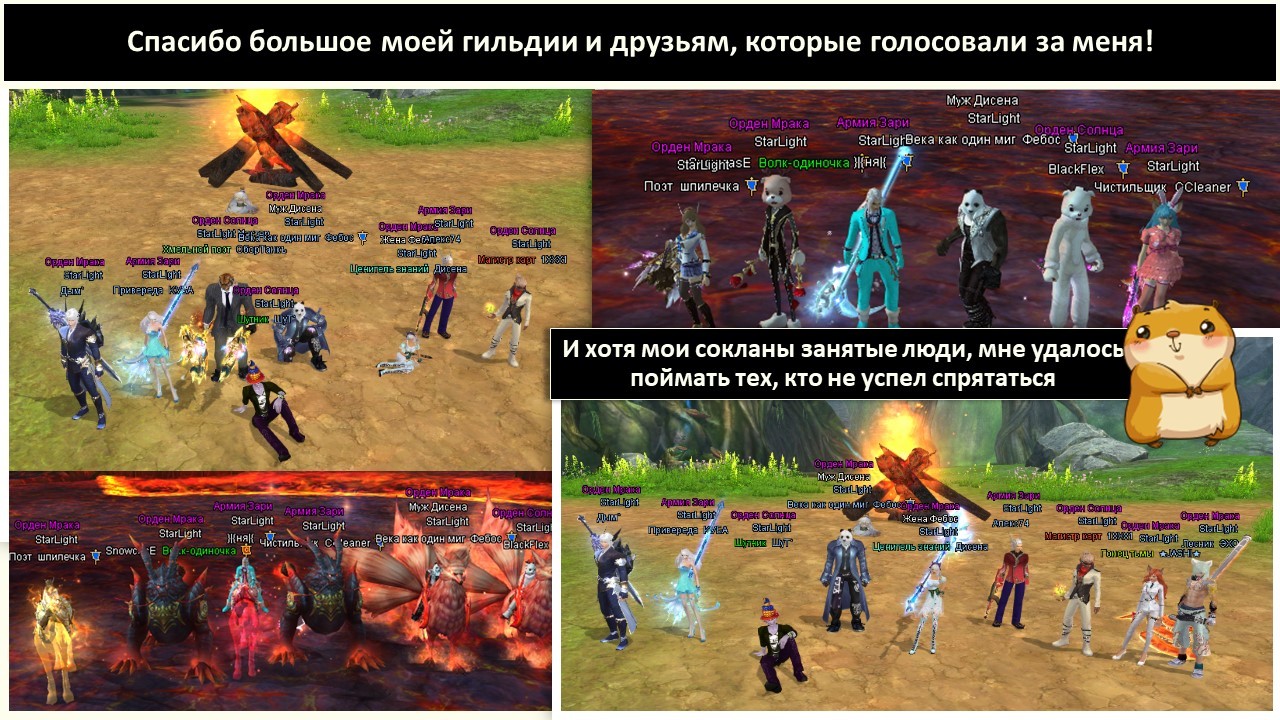 - Сделайте скриншот на память: на нем должен быть ваш персонаж, а также товарищи по гильдии, которые голосовали за вас в первом туре.