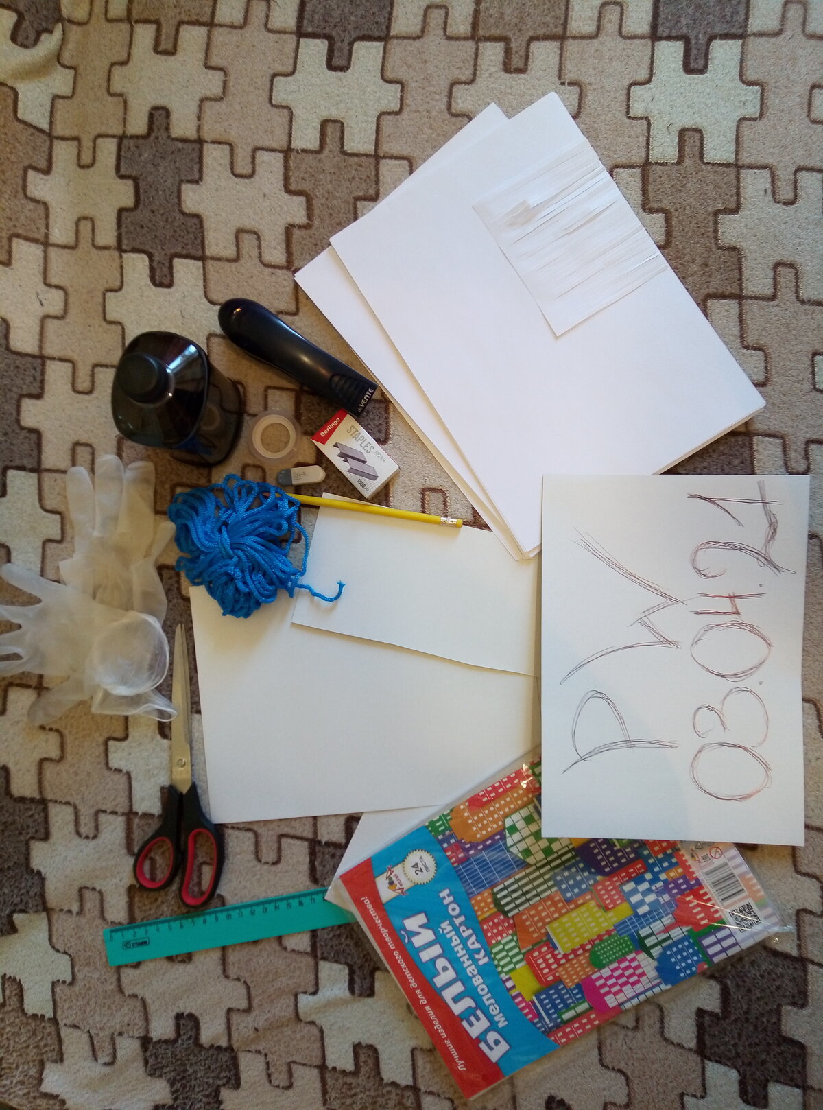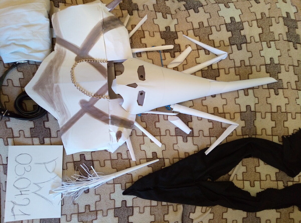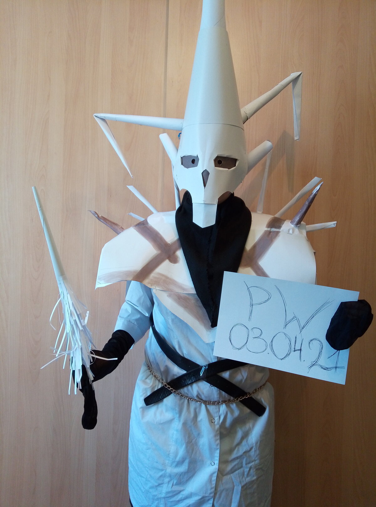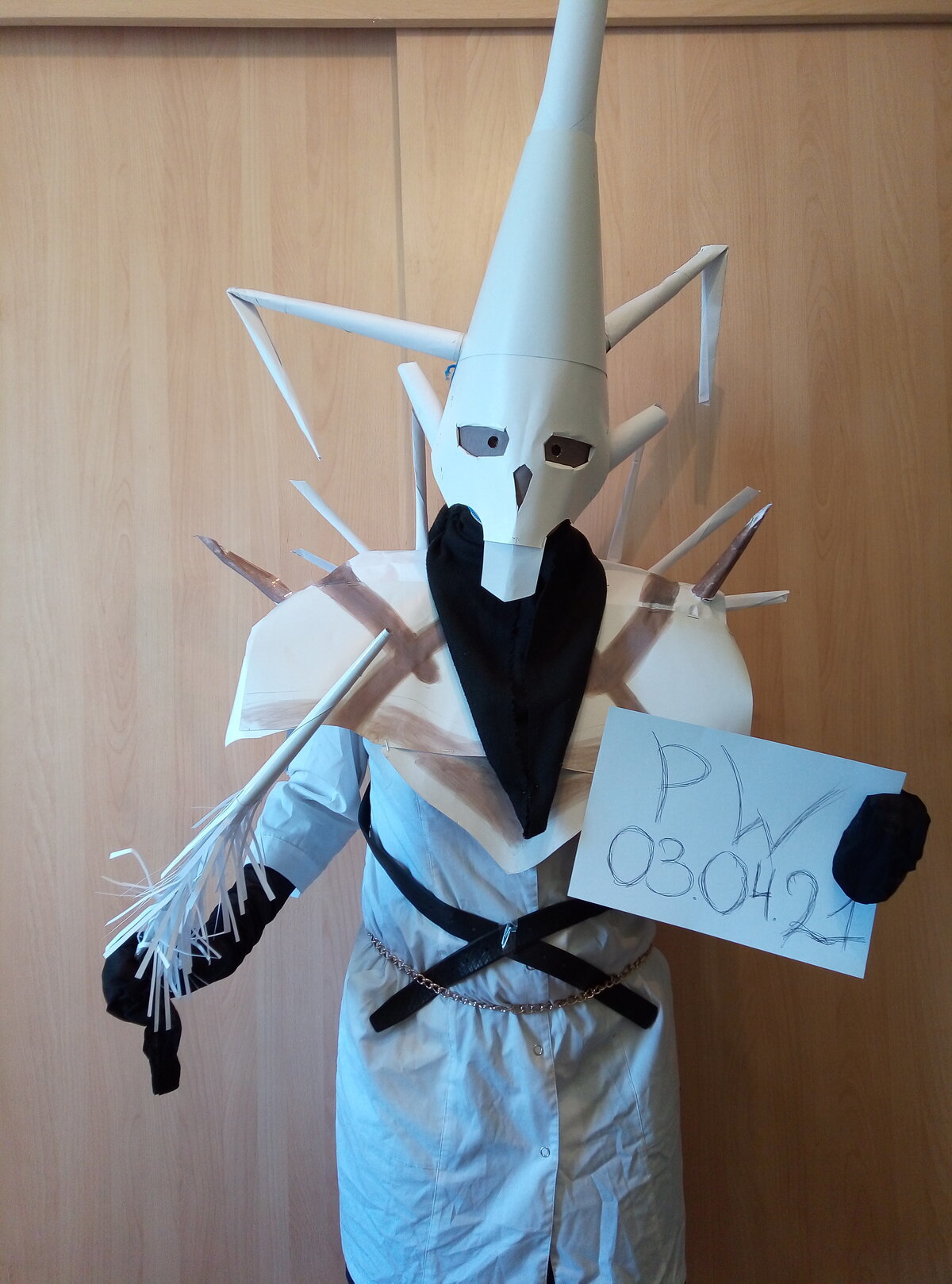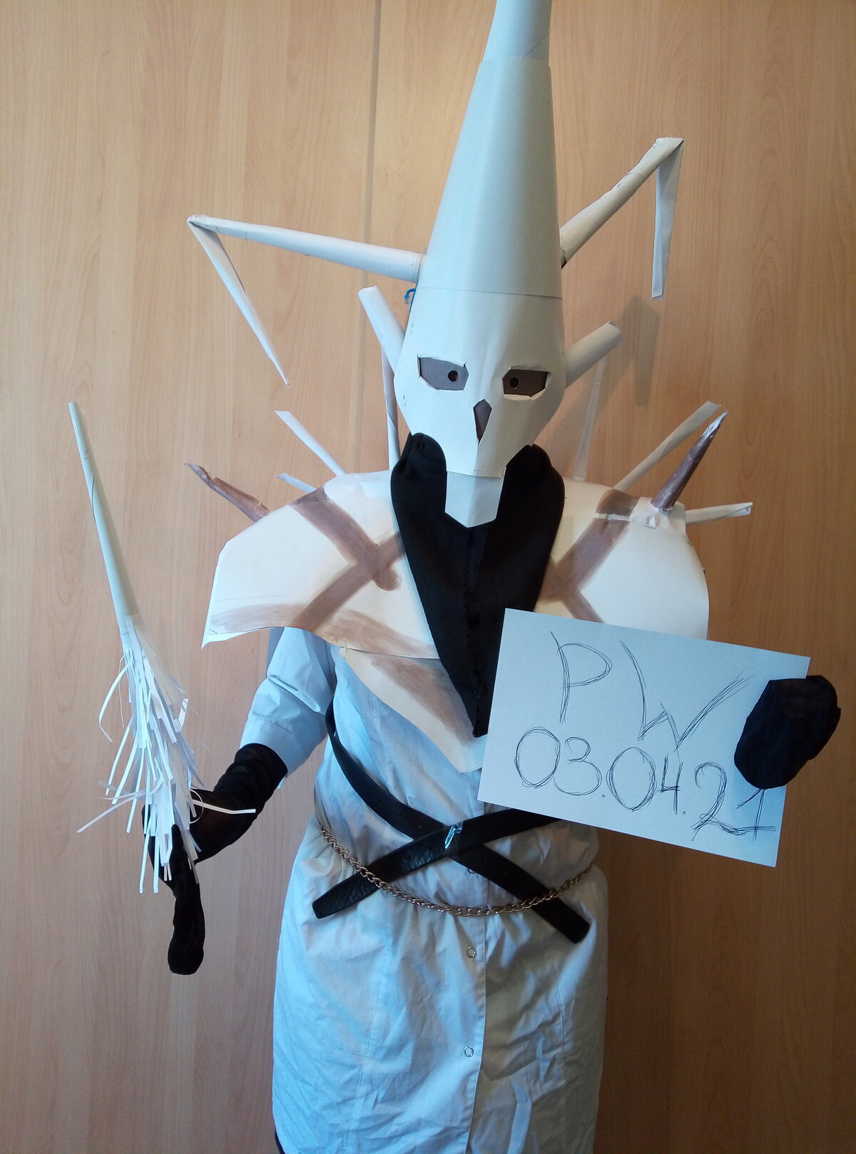 Что было мною использовано, для создания образа: белый картон, листы белой бумаги А4, канцтовары, степлер, скотч, краска, нить, белый халат и ремни.