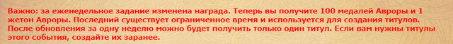 Важно: за еженедельное задание изменена награда. Теперь вы получите 100 медалей Авроры и 1 жетон Авроры. Последний существует ограниченное время и используется для создания титулов. После обновления за одну неделю можно будет получить только один титул. Если вам нужны титулы этого события, создайте их заранее.