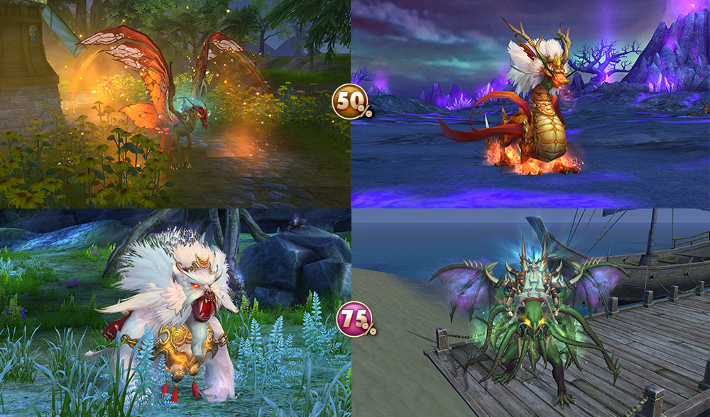 - ездовые питомцы — Крылатый ящер, Красный дракон, Ужас глубин, Ледяная обезьяна;