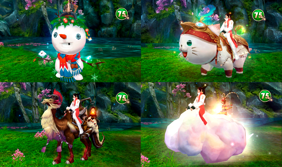 - ездовые питомцы — Снежная кошка, Верблюд, Снеговик, Волшебное облако;