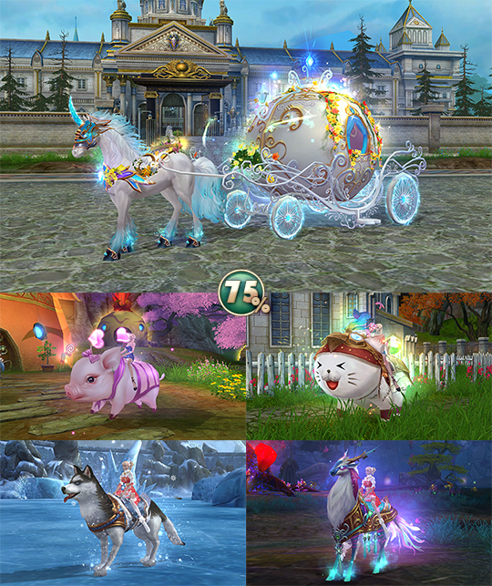 - ездовые питомцы — Гламурная хрюшка, Сибирский хаски, Мистический олень, Снежная кошка, Карета-тыква;