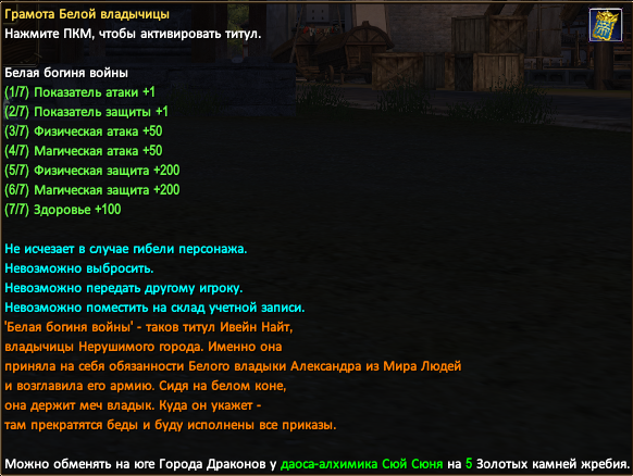 Последние активируют многоуровневые титулы. В списке титулов они даже выделены в отдельную категорию! Их особенность в том, что за каждый уровень вы получаете новые характеристики. Например, за один такой титул можно получить по 50 физической и магической атаки, по 200 физической и магической защиты, по одному показателю атаки и защиты, а также 100 единиц здоровья. Всего уровней семь, а еще они меняют цвет титула.
