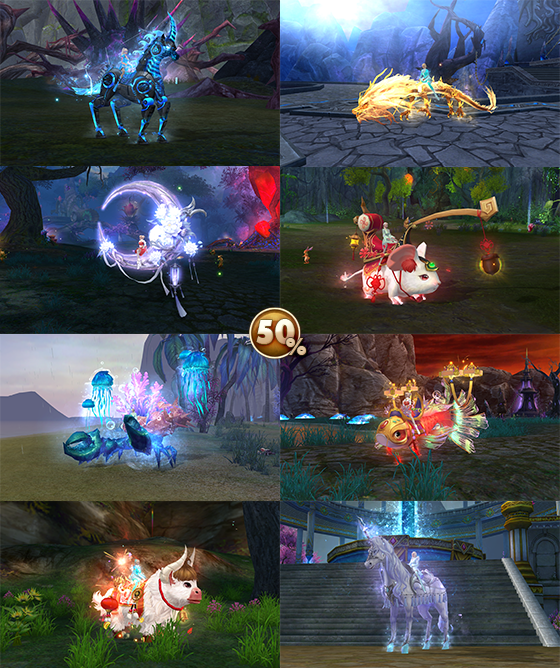 - ездовые питомцы — Серебристый единорог, Счастливчик Ральф, Краб-отшельник, Парчовый карп, Богатая мышка, Сияющий месяц, Мираж дракона истоков и Скакун из будущего;